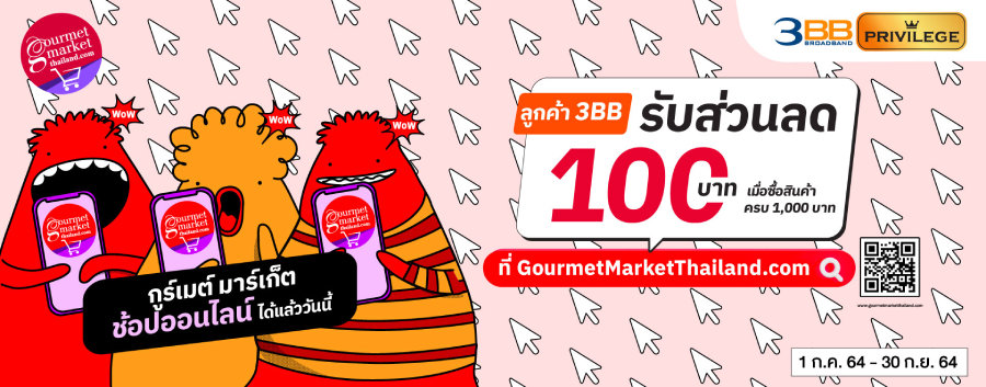 ถือเป็น World Class Gourmet Destination เพียงแห่งเดียวที่คุณจะได้เลือกช้อปผลิตภัณฑ์คุณภาพดีที่สุดของสดตามฤดูกาลที่เลือกสรรมาให้คุณโดยเฉพาะ ทั้งผัก ผลไม้ เนื้อสัตว์ อาหารทะเล อาหารแช่แข็ง และอีกมากมาย ลูกค้า 3BB รับส่วนลด 100 บาท เมื่อซื้อสินค้าครบ 1,000 บาท ที่ www.gourmetmarketthailand.com ตั้งแต่วันนี้ ถึง 30 กันยายน 2564