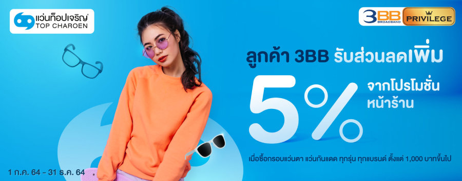 ผู้เชี่ยวชาญด้านสายตามากว่า 60 ปี ให้บริการตรวจวัดสายตาและจำหน่ายแว่นตาแบรนด์เนมในราคาพิเศษ ลูกค้า 3BB รับส่วนลดเพิ่ม 5% จากโปรโมชั่นหน้าร้าน เมื่อซื้อกรอบแว่นตา แว่นกันแดด ทุกรุ่น ทุกแบรนด์ ตั้งแต่ 1,000 บาทขึ้นไป ระยะเวลาโปรโมชั่นถึง 31 ธันวาคม 2564