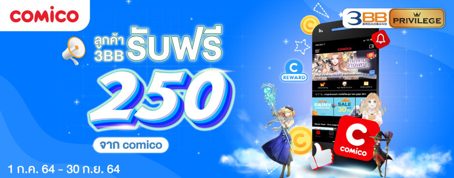 สนุกกับคลังการ์ตูนและนิยายออนไลน์ กว่า 2,300 เรื่อง ทั้งการ์ตูนแปล ลิขสิทธิ์แท้ ส่งตรงจากญี่ปุ่น เกาหลี ไต้หวัน จีน และไทย เนื้อเรื่องเข้มข้น สนุกจนวางไม่ลง คอไหนก็เลิฟสุดๆ โดยเฉพาะ สายวาย สายแฟนตาซี อัปเดตตอนใหม่ทุกวัน เปิดตัวเรื่องใหม่ทุกสัปดาห์ สิทธิพิเศษสำหรับลูกค้า 3BB รับฟรี 250 Reward Coins จาก Comico รับสิทธิ์ได้ที่ 3BB Member Application แล้วนำรหัสเพื่อรับสิทธิ์ที่ Comico Application สิทธิพิเศษถึงวันที่ 30 กันยายน 2564