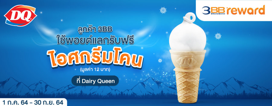 ไอศกรีมที่มีเอกลักษณ์เฉพาะตัว พร้อมเสิร์ฟความอร่อยให้กับลูกค้า 3BB ได้ฟินยิ่งขึ้น เพียงใช้ 30 พอยต์ รับฟรีไอศกรีมโคน (มูลค่า 12 บาท) ที่ร้านแดรี่ควีนทุกสาขาที่ร่วมรายการ ยกเว้น สาขาจังซีลอน 1, จังซีลอน 2, เทสโก้ โลตัส สมุย หาดเฉวง, เซ็นทรัลเฟสติวัล สมุย, ร้านเอ้าดอร์, ร้านทรัค, ร้านโมบาย และสาขาในสนามบินทุกสาขา ระยะเวลาโปรโมชั่นถึง 30 กันยายน 2564