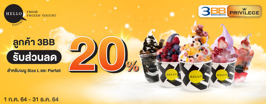 โยเกิร์ตสไตล์กรีกที่มีความเข้มข้น รสสัมผัสนุ่ม ละมุนลิ้น เพื่อความสดชื่นแถมดีต่อสุขภาพ ลูกค้า 3BB รับส่วนลด 20% เมื่อซื้อ Hello Yogurt size L และ Parfait ที่ร้าน Hello Yogurt 5 สาขาที่ร่วมรายการ ได้แก่ รพ.กรุงเทพ (Bangkok Plaza), รพ.จุฬาฯ (Bwell Foodmall), เซ็นทรัลพลาซ่า ลาดพร้าว ชั้น 3, Siam Premium Outlets (ระหว่างประตู C & D) และ สยามพารากอนถึง 31 ธันวาคม 2564