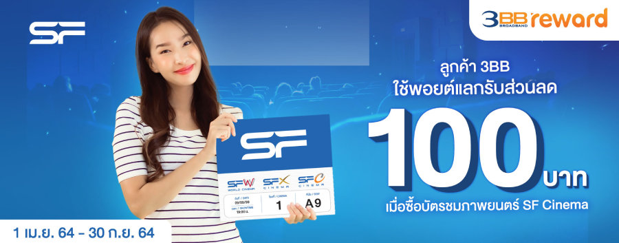 เติมความสุขกับภาพยนตร์ซักเรื่องที่คุณชื่นชอบ สิทธิพิเศษลูกค้า 3BB ใช้ 200 พอยต์ แลกรับส่วนลด 100 บาท เมื่อซื้อบัตรชมภาพยนตร์ ประเภทที่นั่ง Deluxe Seat, Premium Seat และ Prime Seat ทุกรอบ ที่โรงภาพยนตร์ในเครือ เอส เอฟ ทุกสาขา (ยกเว้น สาขา Emprive Cineclub)