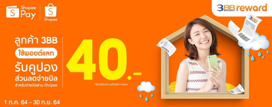 ShopeePay กระเป๋าเงินอิเล็กทรอนิกส์ ที่จะทำให้ชีวิตของคุณสะดวกสบายขึ้นกว่าเดิม ลูกค้า 3BB ใช้ 80พอยต์ แลกรับคูปองส่วนลด 40 บาท สำหรับจ่ายบิลทุกประเภทเมื่อจ่ายผ่าน Shopee Application รับสิทธิ์ได้ตั้งแต่วันนี้ถึง 30 กันยายน 2564