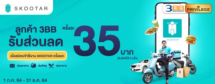 เรียกใช้แมสเซ็นเจอร์มือโปร ส่งด่วนภายใน 2 ชั่วโมง ในเขตกรุงเทพฯและปริมณฑล ไม่ว่าจะเป็นส่งเอกสาร เก็บเช็ค วางบิล ส่งพัสดุ ฝากซื้อ-ส่งอาหาร สำหรับลูกค้า 3BB ที่เป็นลูกค้าใหม่ยังไม่เคยใช้บริการ รับส่วนลด 35 บาท (รับสิทธิ์ได้ 2 ครั้ง) เมื่อสมัครเข้าใช้งาน SKOOTAR ส่วนลูกค้าปัจจุบัน รับส่วนลด 5% เมื่อใช้บริการ กดรับรหัสส่วนลดได้ที่ 3BB Member Application แล้วนำไปกรอกเพื่อรับส่วนลดได้ที่ SKOOTAR Application และ www.skootar.com ตั้งแต่วันนี้ถึง 31 ธันวาคม 2564