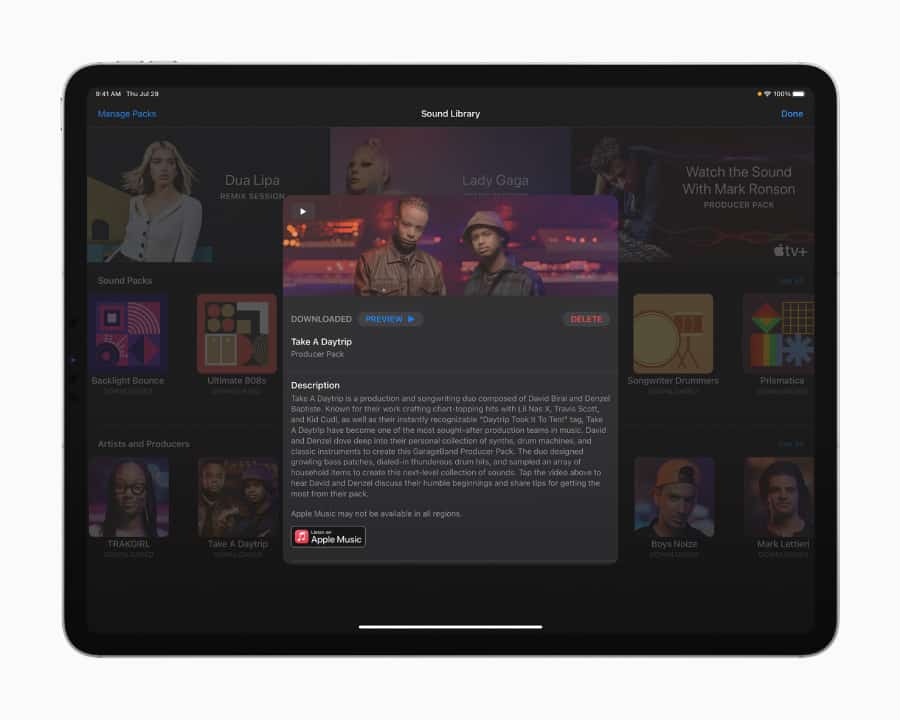 วันนี้นักดนตรีสามารถทำเพลงของตัวเองโดยอาศัยตัวช่วยจากโปรดิวเซอร์ชื่อดังแห่งยุคได้ด้วย Producer Pack ใหม่ทั้ง 7 แพ็คที่สร้างมาสำหรับ GarageBand โดย Boys Noize, Mark Lettieri, Oak Felder, Soulection, Take A Daytrip, Tom Misch และ TRAKGIRL โดยที่ Producer Pack แต่ละชุดนั้นอัดแน่นไปด้วยลูป บีท เครื่องดนตรี ชุดกลอง ซินธ์แพตช์ และแซมเพิ่ลหลายร้อยแบบที่ไม่มีลิขสิทธิ์ ซึ่งแต่ละแบบก็มีซาวด์และกลิ่นอายที่เป็นเอกลักษณ์ของโปรดิวเซอร์แต่ละคน นอกจากนี้ภายในแอปยังมีวิดีโอจากโปรดิวเซอร์แต่ละคนที่จะมาให้กำลังใจมือใหม่ และอธิบายกระบวนการสร้างสรรค์ของตัวเองแบบเจาะลึก