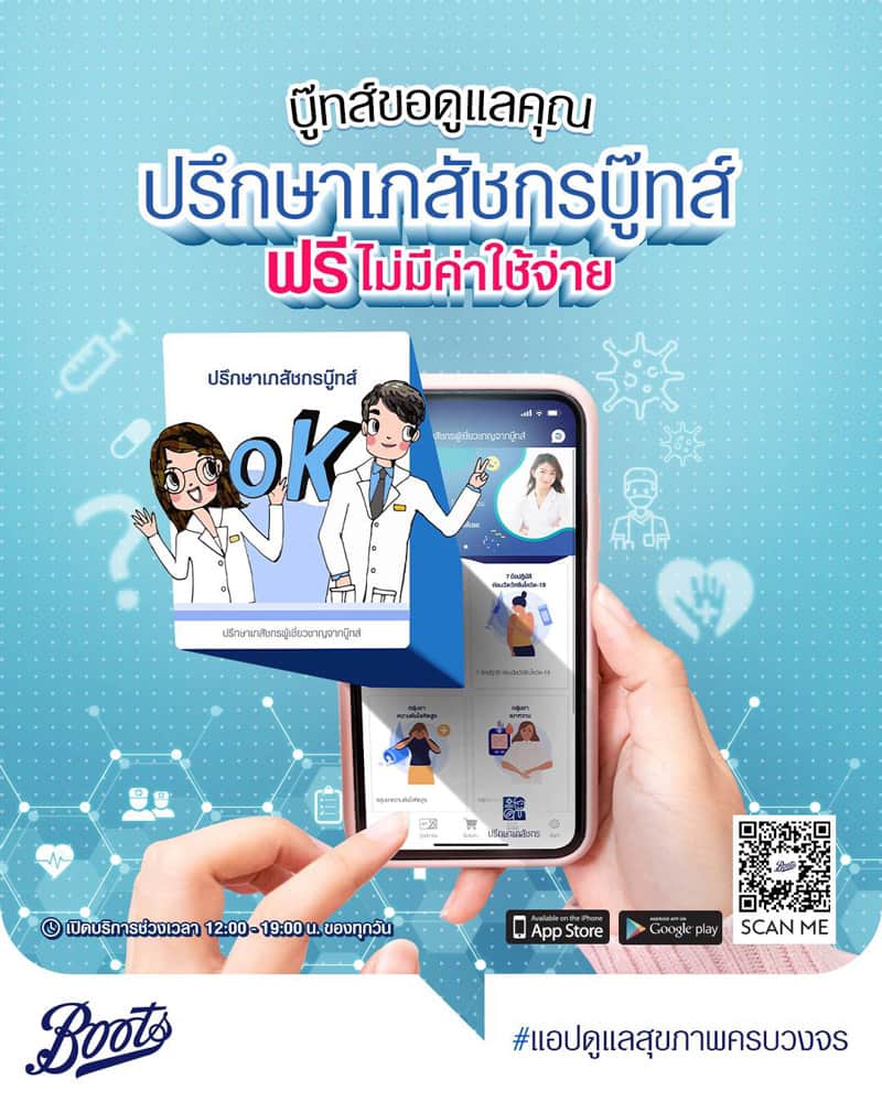 ให้คำปรึกษาด้านการดูแลสุขภาพที่เชื่อถือได้จากเภสัชกรผู้เชี่ยวชาญจากบู๊ทส์ ซึ่งพร้อมดูแลสุขภาพคนไทยแบบ O2O (Online to Offline) เพื่อส่งเสริมสุขภาพและความเป็นอยู่ที่ดีขึ้น ทั้งนี้ เภสัชกรผู้เชี่ยวชาญจากบู๊ทส์ ได้ผ่านการอบรมความรู้ด้านสุขภาพและข้อมูลเชิงลึกเกี่ยวกับ COVID-19 จากวอลกรีนส์ บู๊ทส์ อลิอันซ์ (หรือ ดับเบิ้ลยูบีเอ) กิจการระดับโลกแห่งแรกที่ดำเนินธุรกิจด้านสุขภาพและความเป็นอยู่ที่ดีชั้นนำ และบู๊ทส์ ประเทศไทย เป็นประจำทุกสัปดาห์ ปัจจุบัน บู๊ทส์มีจำนวน 240 สาขาทั่วประเทศ มีเภสัชกรของบู๊ทส์จำนวน 288 คน ที่พร้อมให้คำปรึกษาเรื่องสุขภาพ และตอบปัญหาแบบส่วนตัว ทั้งเรื่องที่เกี่ยวกับ COVID-19 โรคประจำตัว ความกังวลใจเรื่องสุขภาพ ผิวพรรณ รวมไปถึงการดูแลสุขภาพต่างๆ”