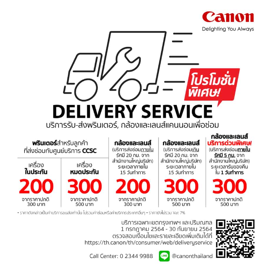 - บริการรับ-ส่งกล้องและเลนส์ทุกรุ่นของแคนนอนเพื่อนำมาซ่อมที่ศูนย์บริการสำนักงานใหญ่ สำหรับพื้นที่กรุงเทพฯ และปริมณฑล มีให้เลือกแบบซ่อมปกติ (เปลี่ยนอะไหล่) ภายในระยะเวลาทำการ 15 วัน และแบบซ่อมด่วนภายใน 1 วัน (เฉพาะบริการความสะอาด) ค่าบริการรับและส่ง เริ่มต้นที่ 200-300 บาท โดยสามารถใช้บริการโปรโมชั่นกันได้ยาว ๆ ตั้งแต่วันนี้ถึง 30 กันยายน 2564 ซึ่งบริการนี้ถือว่าตอบโจทย์การใช้ชีวิตในยุค New Normal ของลูกค้าให้สะดวกสบายและคลายกังวลไปได้มากทีเดียว