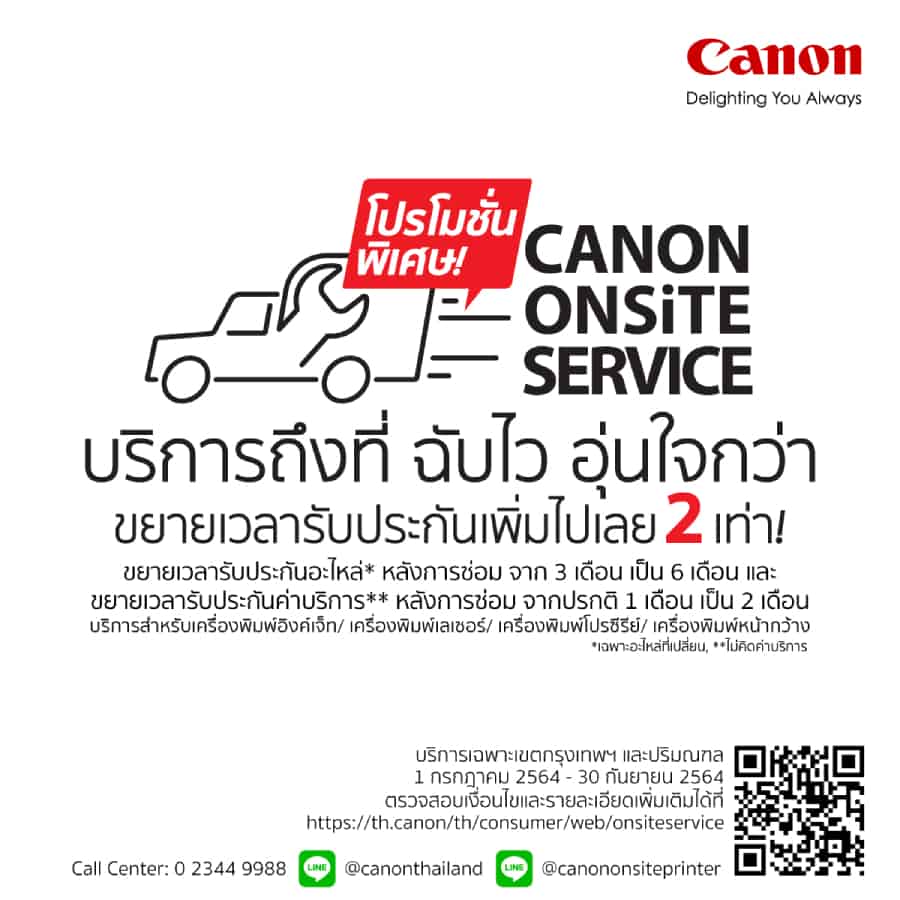 สำหรับบ้านพักอาศัย โฮมออฟฟิศขนาดย่อม หรือออฟฟิศขนาดใหญ่ ที่ใช้เครื่องพรินเตอร์เลเซอร์ขนาดใหญ่ หรือเครื่องพรินเตอร์แบบมัลติฟังก์ชั่นครบทั้งพิมพ์ สแกน และถ่ายเอกสาร หรือมีการติดตั้งซอฟต์แวร์เพื่อช่วยให้การทำงานง่ายขึ้น เมื่อเกิดปัญหา และต้องการผู้เชี่ยวชาญมาช่วยแก้ไขอย่างทันท่วงที แคนนอนมีบริการ Onsite Service ส่งช่างผู้เชี่ยวชาญเข้าไปซ่อมพรินเตอร์ให้ลูกค้าได้อุ่นใจถึงที่ในเขตกรุงเทพฯ และปริมณฑล (โดยช่างที่ปฏิบัติงานนอกสถานที่ทุกคนจะต้องปฏิบัติตามมาตรการป้องกันการแพร่ระบาดของ Covid-19 อย่างเคร่งครัด ด้วยการสวมหน้ากากอนามัย มีการเช็ดทำความสะอาดอุปกรณ์ และสวมถุงมือ ตลอดการปฏิบัติงาน)