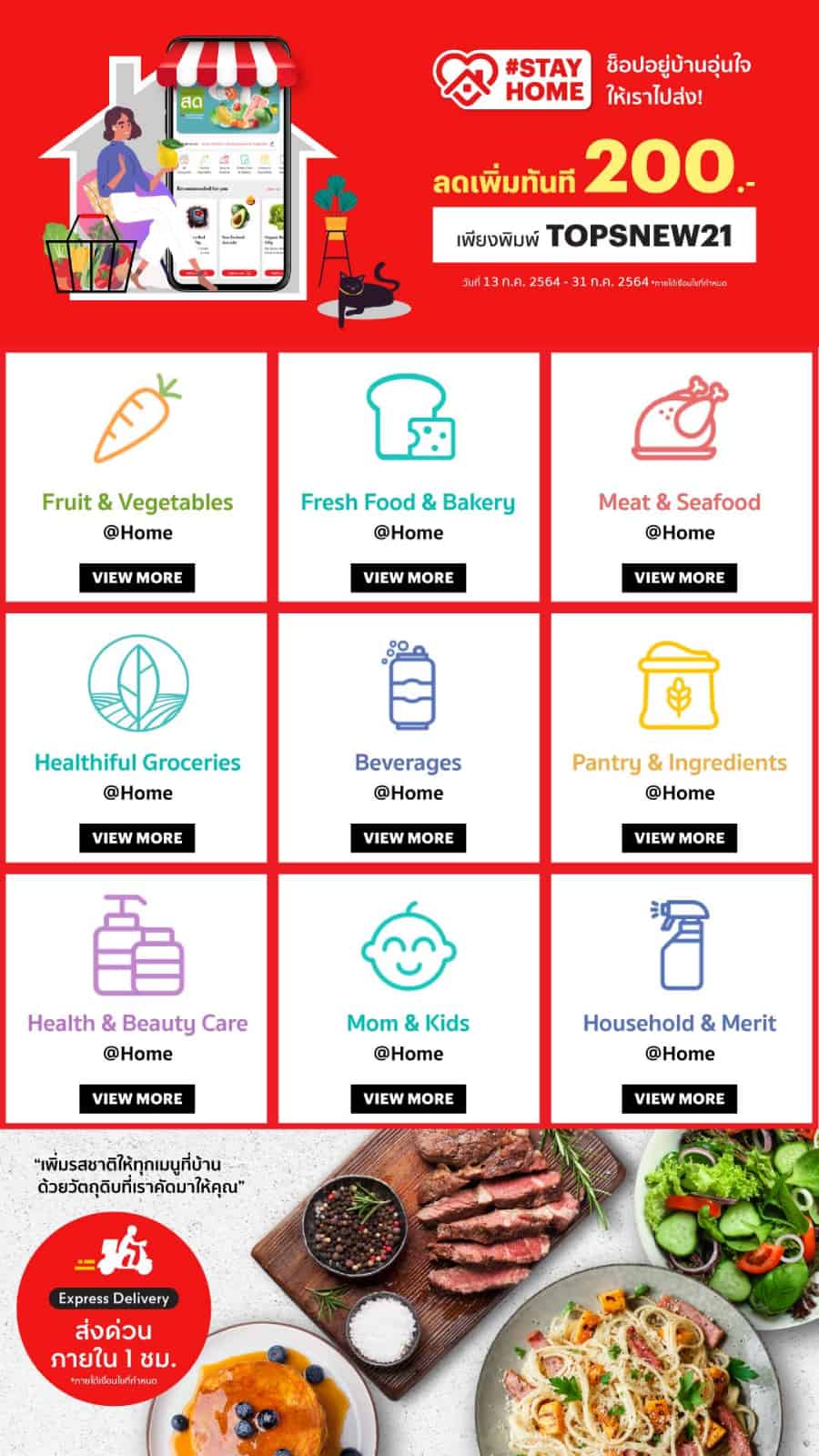 นอกเหนือจากนี้ ในช่วงที่ผู้บริโภคต้องใช้เวลาอยู่ที่บ้าน เราได้จัดเตรียมสินค้าอาหาร และสินค้าอุปโภคบริโภค บนแอปพลิเคชัน Tops Online – Food & Grocery ซูเปอร์มาร์เก็ตออนไลน์อันดับ 1 ของไทย อัดแน่นไปด้วยสินค้าต่างๆ ไม่ว่าจะเป็นอาหารที่สดใหม่ อาหารพร้อมทาน ชุดทำกับข้าวเองที่บ้าน ขนมและสแน็กต่างๆ จากทั่วโลก สินค้าเพื่อคนรักสุขภาพ Healthiful ผักผลไม้สดที่ส่งตรงจากเกษตรกร สินค้า Best Selling มากกว่า 20,000 รายการ และสินค้า Best Deal ที่คุ้มค่าคุ้มราคา