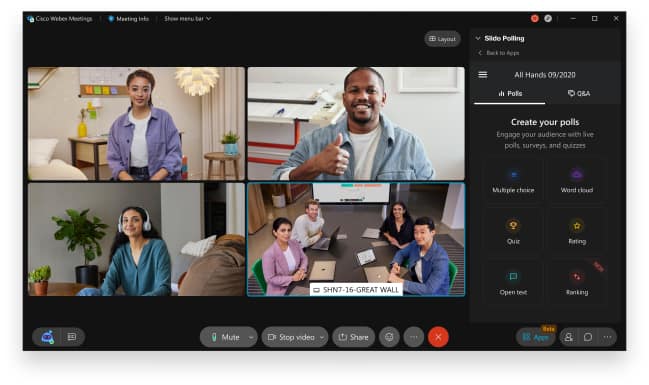 - เครื่องมือสำหรับการโต้ตอบกับผู้ชม: การสำรวจความเห็น แบบทดสอบ ถาม-ตอบ และอื่นๆ ซึ่งขับเคลื่อนด้วยเทคโนโลยีของ Slido นับเป็นโซลูชั่นแรกของอุตสาหกรรมที่มีส่วนร่วมของผู้ชม (Audience Engagement) โดยจะถูกบูรณาการไว้ในทุกประสบการณ์ของการทำงานร่วมกัน ตอนนี้การสำรวจความเห็น (polling) พร้อมใช้งานแล้วในส่วนของการประชุม และจะพร้อมใช้งานในไม่ช้าในส่วนของอีเว้นท์