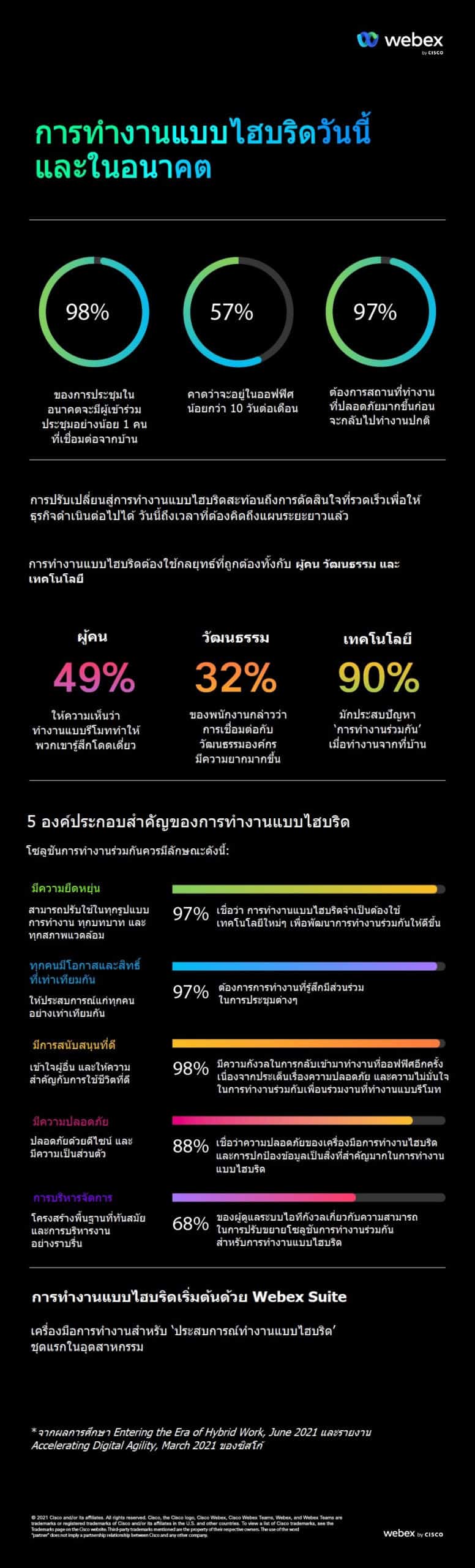 “การทำงานแบบไฮบริดจำเป็นต้องมีเป็นภาวะผู้นำ วัฒนธรรม ความคิดที่คำนึงถึง ‘ผู้คน’ เป็นหลัก รวมถึงเทคโนโลยีที่เหมาะสมซึ่งมอบประสบการณ์อย่างเท่าเทียมกันสำหรับทุกคน ไม่ว่าพวกเขาจะอยู่ที่ใดก็ตาม ภารกิจของซิสโก้คือการขับเคลื่อนอนาคตสำหรับ ‘ทุกคน’ (Inclusive Future for All) และกลายเป็นสิ่งสำคัญมากกว่าครั้งใดเมื่อเราเข้าสู่ยุคการทำงานแบบไฮบริด” ทวีวัฒน์ จันทรเสโน, กรรมการผู้จัดการของซิสโก้ในประเทศไทยและอินโดจีน กล่าว “เราใช้ประโยชน์จากความสามารถของ Webex Suite เพื่อสร้างสรรค์สิ่งใหม่ที่ไม่ใช่แค่การประชุม แต่เป็นประสบการณ์ที่สร้างขึ้นสำหรับทุกคนด้วยเครื่องมือที่ชาญฉลาดเพื่อให้มั่นใจว่าทุกคนอยู่ในโลกแห่งไฮบริดอย่างเท่าเทียม”
