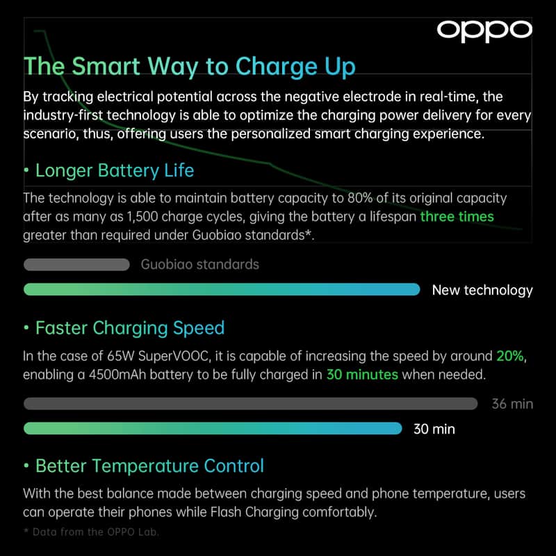 - ความเร็วในการชาร์จตามสถานการณ์เฉพาะที่ดียิ่งขึ้น: ความเร็วในการชาร์จสามารถเพิ่มขึ้นได้ตามสถานการณ์เฉพาะ โดยจะเปลี่ยนไปตามค่ากำลังไฟฟ้าสูงสุด ณ ขณะนั้น ที่แบตเตอรี่จะสามารถรองรับได้อย่างปลอดภัย โดยในกรณีของ 65W SuperVOOC นั้น จะสามารถเพิ่มความเร็วได้ประมาณ 20% ทำให้สามารถชาร์จแบตเตอรี่ขนาด 4500mAh ให้เต็มได้ภายใน เวลาเพียง 30 นาทีเมื่อจำเป็น