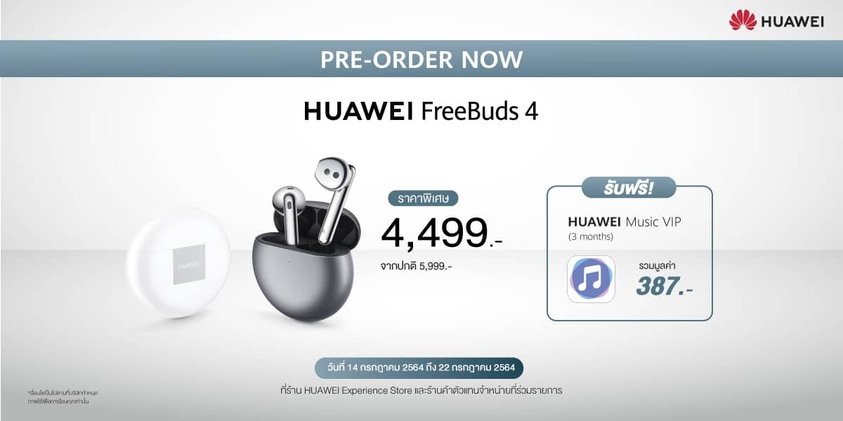พิเศษสำหรับช่วง Pre-order ระหว่างวันที่ 14 กรกฎาคม 2564 ถึง 22 กรกฎาคม 2564 สามารถเป็นเจ้าของ HUAWEI FreeBuds 4 ได้ในราคาเพียง 4,499 บาท (จากราคาปกติ 5,999 บาท) พร้อมรับฟรีบริการ HUAWEI Music VIP นาน 3 เดือน รวมมูลค่า 387 บาท เมื่อสั่งซื้อผลิตภัณฑ์ได้ที่หน้าร้าน HUAWEI Experience Store และร้านค้าตัวแทนจำหน่ายที่ร่วมรายการ โดยสามารถอ่านรายละเอียดเพิ่มเติมเกี่ยวกับผลิตภัณฑ์ได้ที่นี่ หรือสั่งซื้อผ่านช่องทางออนไลน์ได้ที่ HUAWEI Online Store , Shopee, Lazada และ JD Central