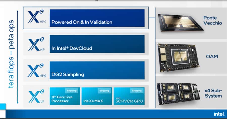 ความพร้อมใช้งานของ Ponte Vecchio จะอยู่ในรูปแบบฟอร์มแฟกเตอร์และระบบย่อยของ OCP Accelerator Module (OAM) เพื่อรองรับความสามารถในการเพิ่มขนาดรวมถึงการขยายโครงสร้างที่จำเป็นสำหรับแอปพลิเคชัน HPC