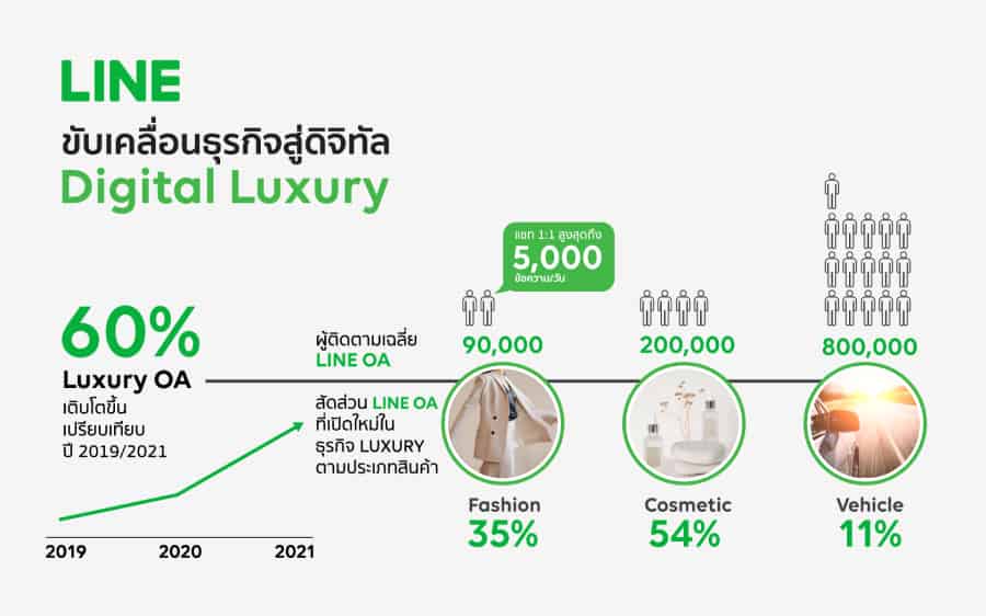 ในขณะเดียวกัน วิกฤตโควิด-19 ได้กลายเป็นปัจจัยเร่งให้พฤติกรรมผู้บริโภคเปลี่ยนแปลงไปอย่างรวดเร็วในช่วง 2 ปีที่ผ่านมา หลากหลายกลุ่มธุรกิจประสบความลำบาก และบางธุรกิจเห็นโอกาส ได้ปรับตัวก้าวเข้าสู่โลกดิจิทัล หนึ่งในกลุ่มธุรกิจที่น่าสนใจ คือ กลุ่มธุรกิจสินค้าหรูหรา Luxury ในประเทศไทยโดยในช่วงปี 2562 – 2564 ที่ผ่านมา มีแบรนด์สินค้าหรูหันมาเปิดใช้งาน LINE OA เป็นช่องทางในการเข้าถึงฐานลูกค้าคนไทยเพิ่มขึ้นโดยรวมถึง 60% โดยแบรนด์หรูที่เปิดใช้งาน LINE OA มากที่สุดคือ กลุ่มเครื่องสำอางหรู เป็นสัดส่วน 54% ของสินค้าหรูทั้งหมด ต่อมาคือแฟชั่นหรูในอัตราส่วน 35% และยานยนต์หรูมีการเปิดใช้งาน LINE OA ที่สัดส่วน 11%