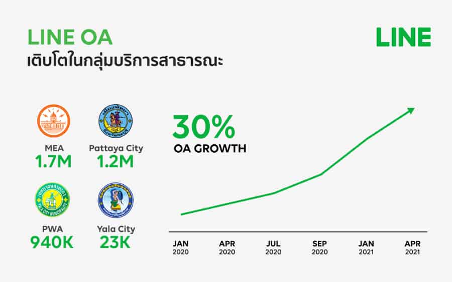 นอกจากภาคธุรกิจแล้ว กลุ่มองค์กรที่สำคัญที่สุดต่อการขับเคลื่อนประเทศไทย คือ กลุ่มบริการสาธารณะต่างๆ ด้วยศักยภาพของแพลตฟอร์ม LINE ที่เข้าถึงคนไทยกว่า 49 ล้านคน LINE OA จึงกลายเป็นตัวกลางสำคัญสำหรับกลุ่มบริการสาธารณะ และองค์กรภาครัฐมากมาย ในการอัพเดทข้อมูล ให้ความรู้ และให้บริการให้ด้านต่างๆ แก่ประชาชนคนไทย อาทิ โรงพยาบาล สาธารณูปโภค น้ำ ไฟ การบริหารส่วนจังหวัด อำเภอ ชุมชนต่างๆ รวมถึงหน่วยงานราชการ โดยเฉพาะในสถานการวิกฤตโควิด เช่น การนัดหมายโรงพยาบาล การแจ้งและรับชำระค่าไฟค่าน้ำ การรับข้อมูลข่าวสารสำคัญของชุมชน โดยไม่ต้องเดินทางมายังสถานที่ให้บริการ เป็นต้น ซึ่ง LINE เล็งเห็นว่าบริการสาธารณะต่างๆ เหล่านี้ แม้จะไม่ได้ส่งผลโดยตรงต่อภาคเศรษฐกิจ แต่ก็ถือเป็นหัวใจสำคัญต่อประเทศไทยที่ควรผลักดันให้เกิดการขับเคลื่อนสู่โลกดิจิทัลเพื่อประโยชน์ต่อองค์รวมของประเทศด้วยเช่นกัน