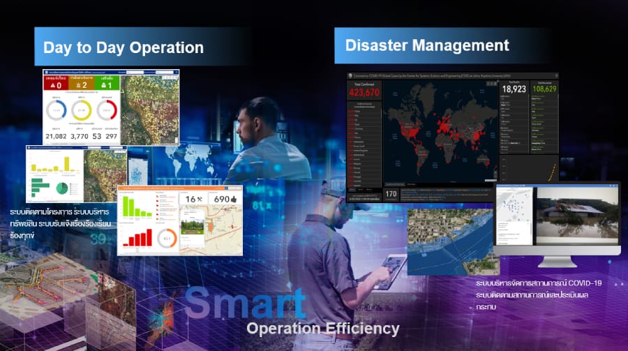 2. ปรับปรุงประสิทธิภาพการดำเนินงานภาพรวม (Operational Efficiency) โดยในส่วนของภาครัฐ มีแอปพลิเคชันพร้อมใช้งานที่ตอบสนองต่อสถานการณ์ที่เกิดขึ้น สามารถเก็บรวบรวมข้อมูล ลงพื้นที่ภาคสนาม มอนิเตอร์สถานะผ่านระบบ ช่วยให้ผู้บริหารสามารถตัดสินใจได้อย่างทันท่วงทีและมีประสิทธิภาพ เช่น การสร้างระบบบริหารจัดการข้อมูลการจัดการภัยพิบัติต่าง ๆ หรืองานติดตามสถานการณ์ฉุกเฉิน ตัวอย่างที่สำคัญ เช่น ระบบติดตามสถานการณ์น้ำท่วมในพื้นที่ หรือระบบบริหารจัดการทรัพยากรด้านสาธารณสุข เป็นต้น