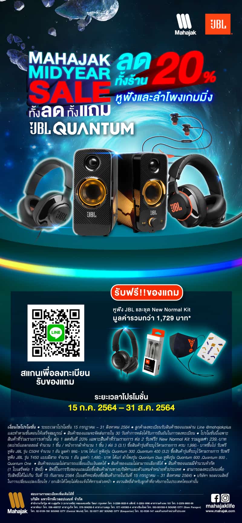 บริษัท มหาจักรดีเวลอปเมนท์ จำกัด จัดโปรโมชั่นสุดพิเศษ MAHAJAK MIDYEAR SALE สินค้าหูฟังและลำโพงเกมมิ่ง JBL Quantum ใช้เรียนและเล่นจบในตัวเดียว ลดราคา 20% เฉพาะสินค้าที่ร่วมรายการ รับฟรี!!ของแถมสุดพิเศษ หูฟัง JBL และชุด New Normal Kit มูลค่ารวมกว่า 1,729 บาท