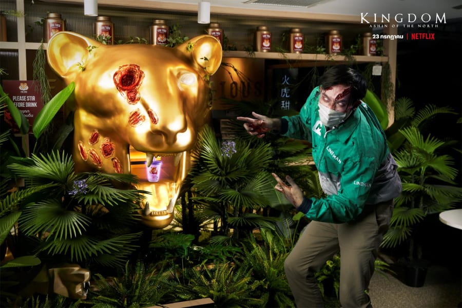 ยังไม่หมดเพียงเท่านี้เพราะ LINE MAN ขอร่วมยกระดับความตื่นเต้นกันแบบไม่มีลิมิตสำหรับผู้ใช้บริการสั่งเครื่องดื่ม “เสือพ่นไฟคืนชีพ” ผ่านแอปพลิเคชั่น LINE MAN โดยเลือกสาขาสยามแควร์ ซอย 3 ระหว่างเวลา 09.00 – 17.00 น. ในวันที่ 23 กรกฎาคม 2564 ซึ่งเป็นวันออนแอร์ของตอนพิเศษ ผีดิบคลั่ง บัลลังก์เดือด: อาชินแห่งเผ่าเหนือ (Kingdom: Ashin of the North) ที่หลายคนปักหมุดรอไว้ ทาง LINE MAN จะจัดไรเดอร์ที่กลายพันธุ์เป็นซอมบี้สมบูรณ์แบบแล้วขับไปเสิร์ฟเครื่องดื่มกันให้ถึงบ้าน เรียกได้ว่าอินกว่านี้ไม่มีอีกแล้ว! แถมด้วยกิจกรรมเล่นเกมเปิดกล่องสมุนไพรคืนชีพลุ้นรับเครื่องดื่ม “เสือพ่นไฟคืนชีพ” จากร้าน Fire Tiger ให้ร่วมสนุกกันได้ทุกวันบนแอปพลิเคชั่น LINE MAN