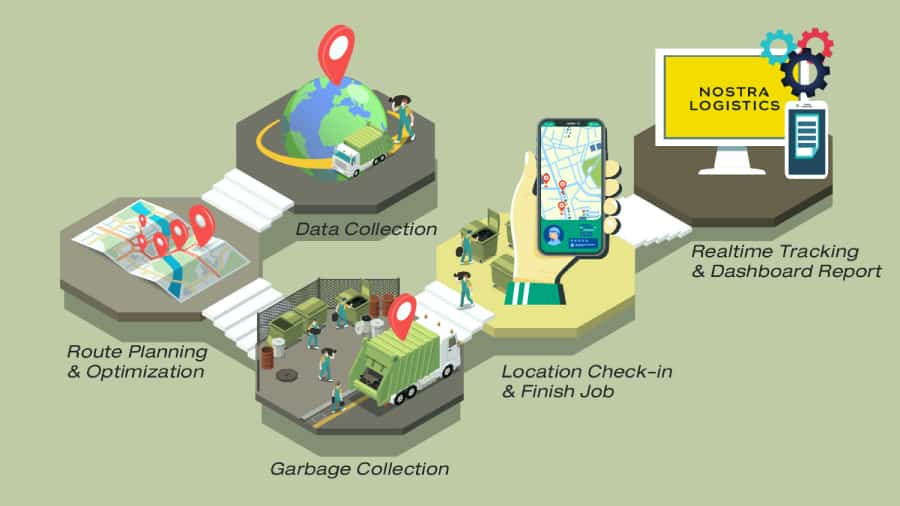 เพื่อประสิทธิภาพการจัดสรรการใช้รถและระยะเวลาที่เหมาะสมในการเดินรถเก็บขยะ กำหนดจุดรวบรวมขยะ คำนวณเส้นทาง และเขตพื้นที่ เพื่อเดินรถเก็บขยะตามจุดต่าง ๆ ไปยังจุดพักขยะ และจุดกำจัดขยะ โดยขั้นตอนเริ่มจากการรวบรวมข้อมูลที่จำเป็นเข้าสู่ระบบ (Data Collection) เช่น ทะเบียนรถ ผู้ขับรถ ตำแหน่งจุดเก็บขยะ จากนั้นกำหนดเส้นทางการเดินรถ จุดที่ต้องเข้าเก็บขยะตามเขตพื้นที่ พร้อมจับคู่รถกับผู้ขับขี่ (Route Optimization) หลังจากปล่อยรถออกไปเก็บขยะแล้ว