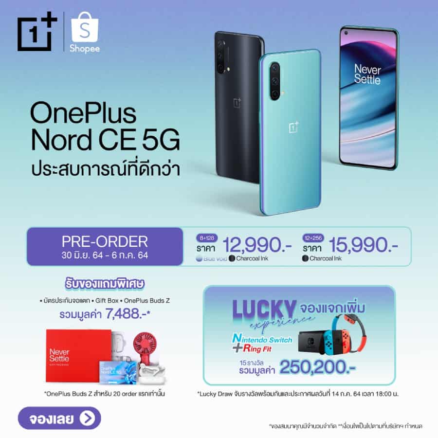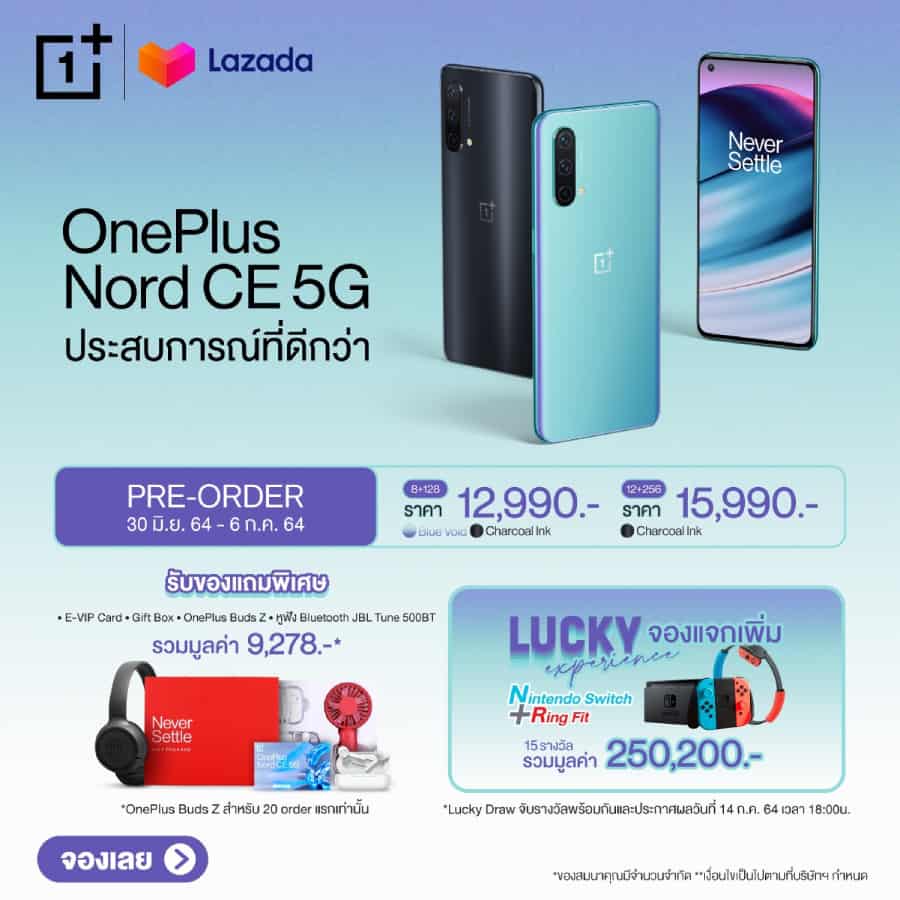 เท่านั้นยังไม่พอ ทาง OnePlus ยังมีกิจกรรม Lucky Experience จองแจกเพิ่ม : สำหรับผู้ที่จองสมาร์ทโฟน OnePlus Nord CE 5G ในระหว่างวันที่ 30 มิถุนายน – 6 กรกฎาคม 2564 ผ่านตัวแทนจำหน่ายอย่างเป็นทางการในประเทศไทย จะได้รับสิทธิ์ลุ้นรับรางวัล Nintendo Switch และ Ring Fit จำนวน 15 รางวัล มูลค่ารวมกว่า 250,200 บาท โดยประกาศรายชื่อผู้โชคดีผ่านทาง Facebook Fanpage OnePlus Thai ในวันที่ 14 กรกฎาคม 2564 ในเวลา 18.00 น.