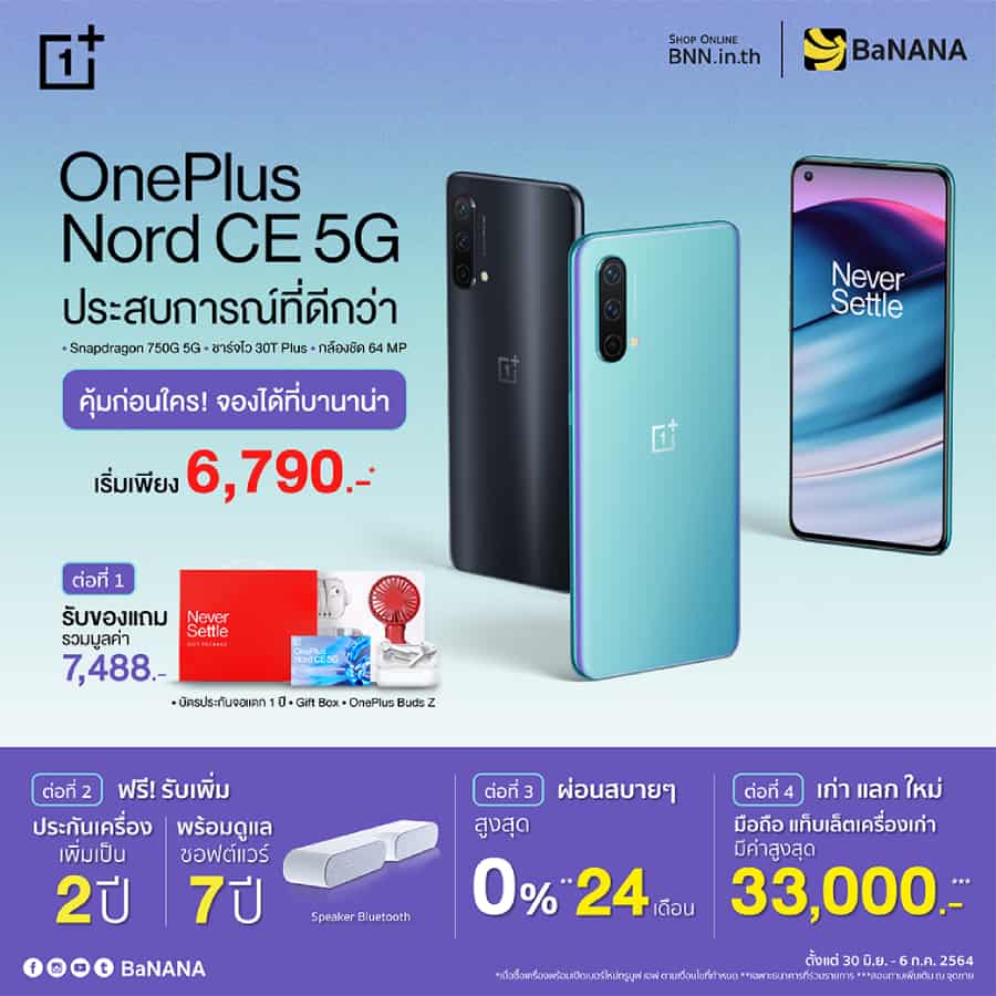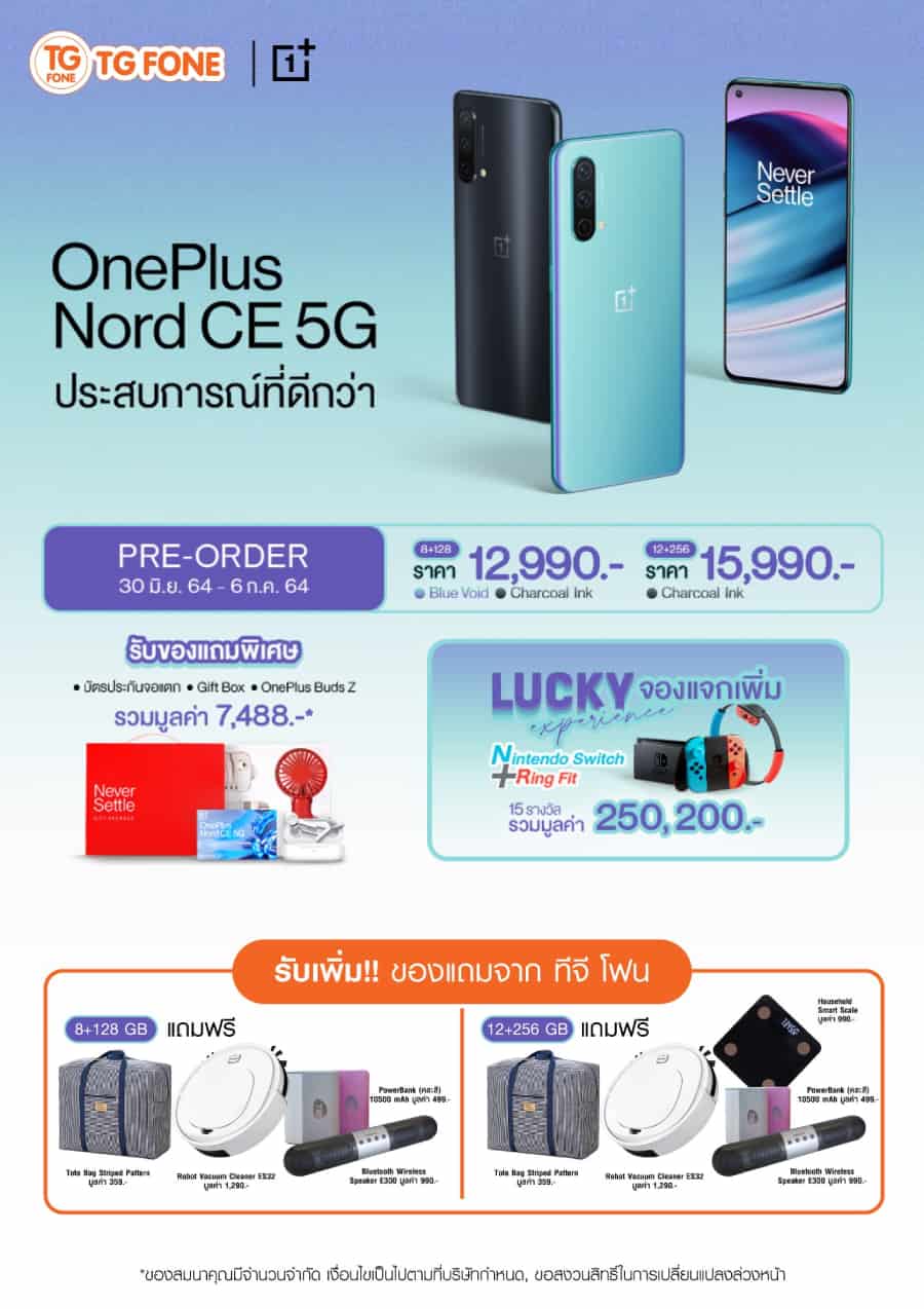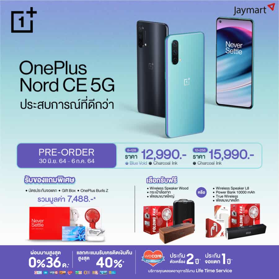 OnePlus Nord CE 5G เริ่มวางจำหน่ายอย่างเป็นทางการในวันที่ 7 กรกฎาคม 2564 โปรโมชัน เปิดพรีออร์เดอร์ตั้งแต่วันที่ 30 มิถุนายน – 6 กรกฎาคม 2564 พร้อมรับของแถมพิเศษ รวมมูลค่ากว่า 7,488 บาท