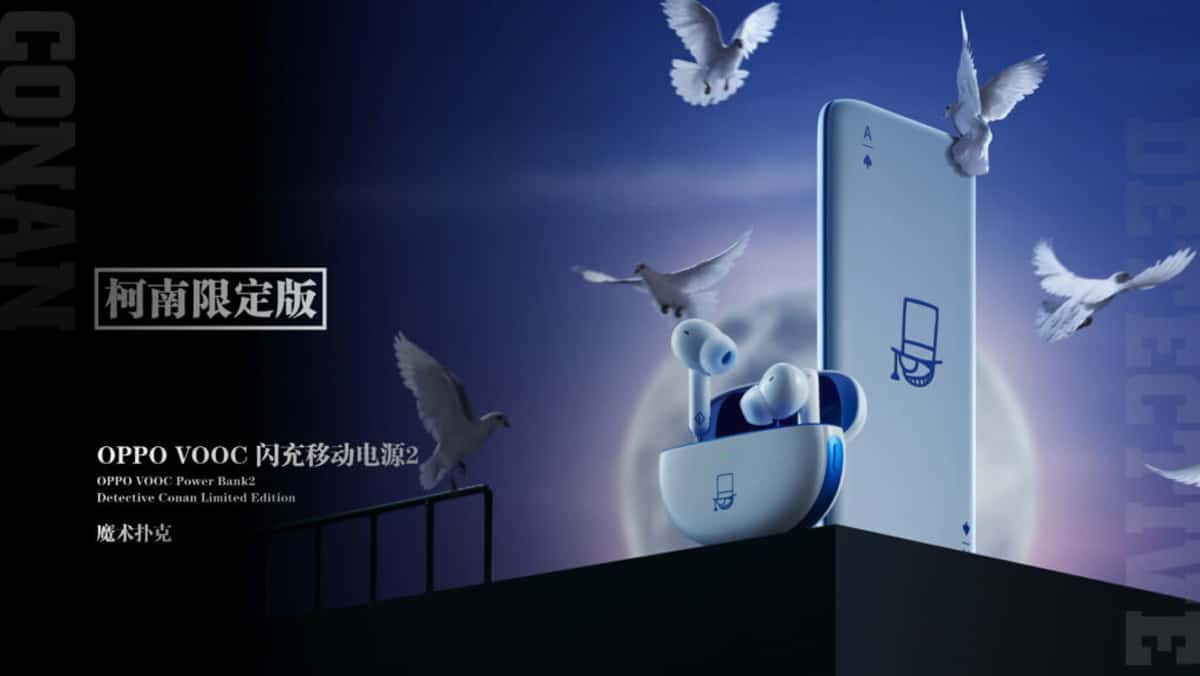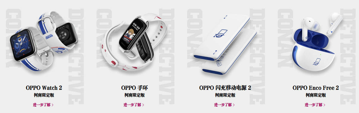 ส่วนหูฟังไร้สาย OPPO Enco Free2 Conan Limited Edition และพาวเวอร์แบงค์ VOOC Flash Charger Power Bank 2 Conan Limited Edition นั้นมาพร้อมลายจอมโจรคิด สีฟ้า-ขาว โดยหูฟังไร้สาย มีจำนวนจำกัดเพียง 10,000 ชิ้น ราคา 599 หยวน หรือประมาณ 3,100 บาท และพาวเวอร์แบงค์ มีจำนวนจำกัดเพียง 10,000 ชิ้น ราคา 249 หยวน หรือประมาณ 1,300 บาท
