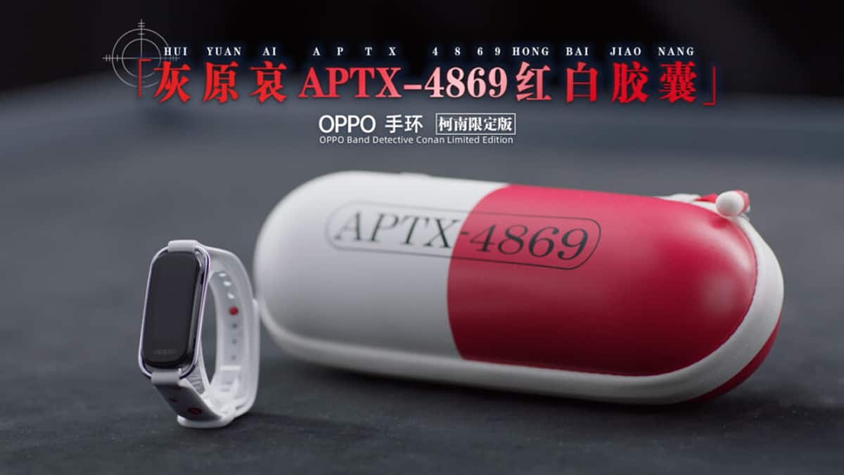 สายรัดข้อมือ OPPO Band Conan Limited Edition มาพร้อมสายรัดลายไฮบาระ ไอ โดยมีแพคเกจรูปทรงยาแคปซูล APTX4869 มีจำนวนจำกัดเพียง 20,000 ชิ้น ราคา 299 หยวน หรือประมาณ 1,600 บาท