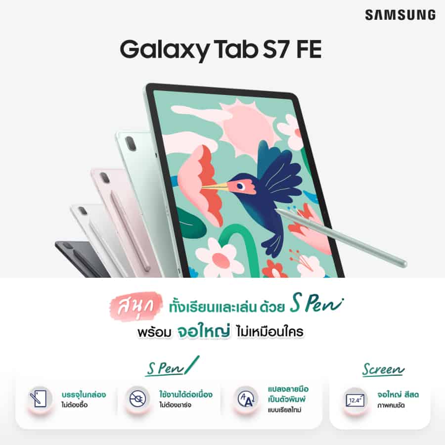 ซัมซุงแนะนำ Galaxy Tab S7 FE แท็บเล็ตรุ่นใหม่ ที่รวมฟีเจอร์สุดโปรดของเหล่าแฟนๆ จากแท็บเล็ตรุ่นแฟลกชิปไว้ในเครื่องเดียว ไม่ว่าจะเป็นหน้าจอขนาดใหญ่ถึง 12.4 นิ้ว ปากกา S Pen ในกล่องไม่ต้องซื้อเพิ่มและไม่ต้องชาร์จแบตเตอรีให้เสียเวลา พร้อมฟีเจอร์ Multi-Active Window เพื่อการใช้งานหลายหน้าต่างพร้อมกัน และฟีเจอร์ Multi instance เพื่อสร้าง Shortcut ให้สามารถทำงานพร้อมกันได้ถึงสามแอปพลิเคชันได้อย่างง่ายดาย มอบประสบการณ์ Multi-Tasking ทั้งเรียนและเล่นได้อย่างไหลลื่นไม่มีสะดุด