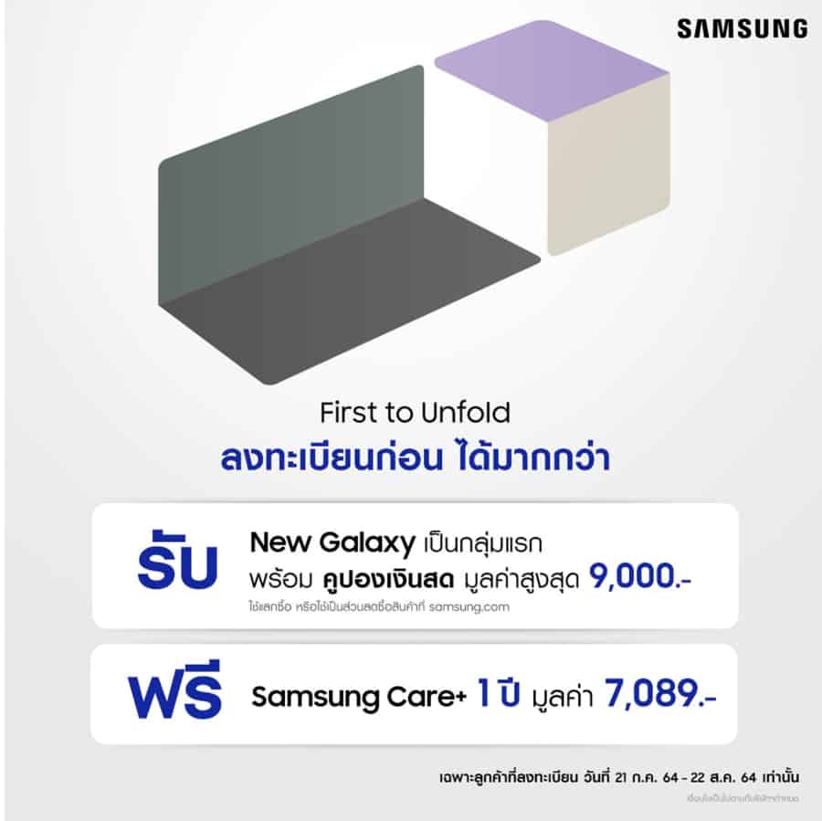 ยุคใหม่ของนวัตกรรมสมาร์ทโฟน เพียงลงทะเบียนผ่านเว็บไซต์ www.samsung.com/th/unpacked ตั้งแต่วันนี้ – 22 ส.ค. 2564 เวลา 23.59 น. พร้อมรับสิทธิพิเศษที่มากกว่า ด้วยคูปองเงินสด มูลค่าสูงสุด 9,000 บาท ใช้แลกซื้อ หรือใช้เป็นส่วนลดซื้อสินค้าที่ samsung.com ในครั้งต่อไป ยิ่งไปกว่านั้น รับฟรี Samsung Care+ เป็นระยะเวลา 1 ปี มูลค่า 7,089 บาท โดยหลังจากที่ลงทะเบียนเป็นที่เรียบร้อยแล้ว กาแลคซี่แฟนจะได้รับโค้ดผ่านทาง E-mail เพื่อนำสิทธิ์ไปสั่งซื้อ The new Galaxy ผ่าน 2 ช่องทางหลักดังนี้