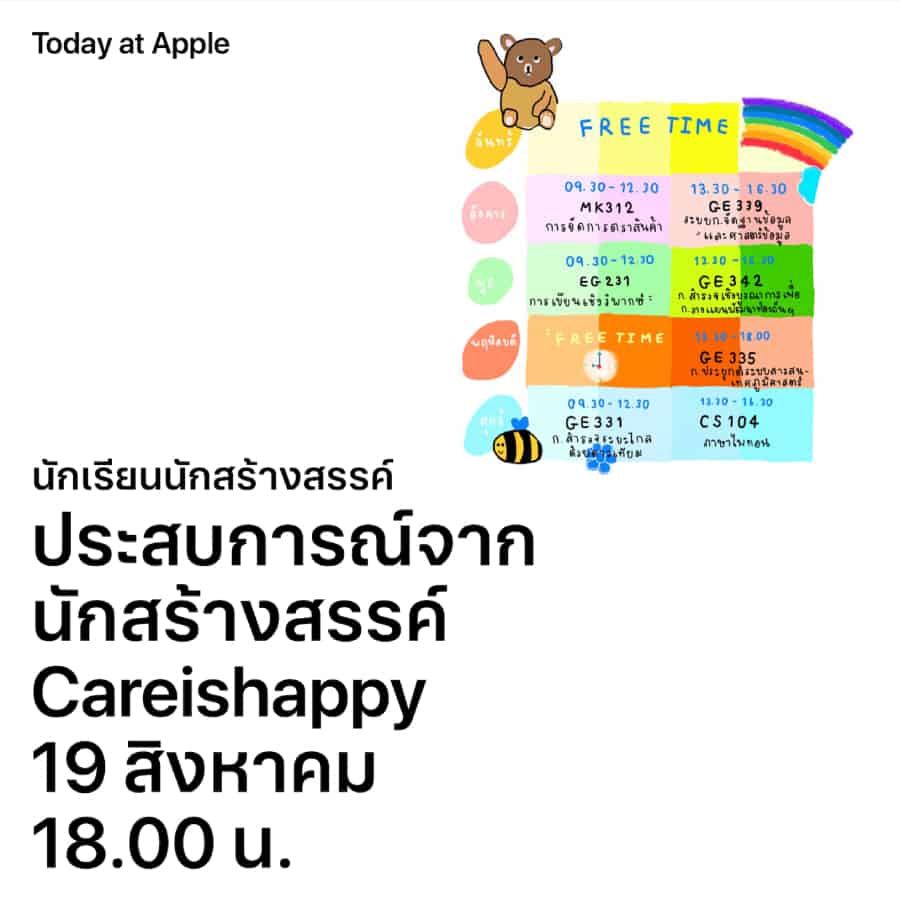 สร้างสีสันให้ตารางเรียนกับ Careishappy วันพฤหัสบดีที่ 19 สิงหาคม 2564เวลา 18:00-19:30 น.มาทำทุกวันให้เป็นระเบียบยิ่งขึ้นกับเซสชั่นดีๆ ในซีรีส์ “นักเรียนนักสร้างสรรค์” ที่จะจุดประกายไอเดียเจ๋งๆ พร้อมสร้างสีสันให้กับการเรียนรู้ ในเซสชั่นนี้ Careishappy เจ้าของสตัดดี้แกรมชื่อดัง จะมาแชร์เทคนิคในการเรียนและบริหารเวลาให้มีประสิทธิภาพ ผ่านการทำตารางเรียนในสไตล์น่ารักสดใส พร้อมจะพาคุณไปสร้างสรรค์ตารางเวลาของตนเองบน iPad โดยใช้แอปโน้ตและ Apple Pencil