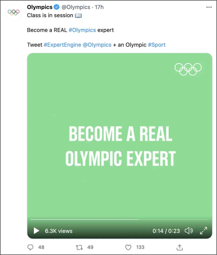 การแข่งขันกีฬาโอลิมปิกทุกครั้งที่ผ่านมา ผู้คนมักจะทวีตข้อความแสดงความคิดเห็นทั้งที่อาจจะไม่ค่อยรู้เรื่องเกี่ยวกับกีฬาประเภทนั้นเท่าไหร่ แต่ครั้งนี้ทวิตเตอร์ทำตัวช่วยใหม่ที่จะเปลี่ยนให้แฟนกีฬาทุกคนสามารถกลายเป็นผู้เชี่ยวชาญได้จริงๆ ด้วย #ExpertEngine ของทวิตเตอร์ ด้วยการทวีตและติดแฮชแท็ก #ExpertEngine และแท็ก @Olympics และติดแฮชแท็กประเภทกีฬาโอลิมปิกที่คุณติดตามเชียร์อยู่ อาทิ #badminton หรือ#boxing จากนั้นก็จะได้รับคลิปวิดีโอที่จะเป็นข้อมูลสำคัญเกี่ยวกับกีฬาประเภทนั้นๆ โดยอัตโนมัติ