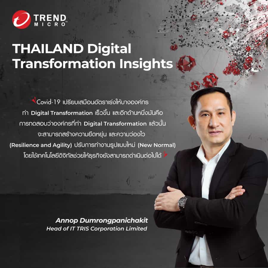 อรรณพ ดำรงพาณิชกิจ ผู้อำนวยการอาวุโส บริษัท ทริส คอร์ปอเรชั่น จำกัด กล่าวถึงการเดินหน้าสู่ ดิจิทัลทรานส์ฟอร์เมชัน ของบริษัท “สำหรับทริส เราเริ่มเดินหน้าเรื่อง ดิจิทัลทรานส์ฟอร์เมชัน ด้วยแรงผลักดันจาก 2 ปัจจัยหลัก คือ เรื่องกระแสหลักที่ผลักดันการพัฒนาเศรษฐศาสตร์มหภาคในระดับโลก ที่จะทำให้เกิดผลกระทบต่อธุรกิจ เศรษฐกิจ สังคม วัฒนธรรม และการดำรงชีวิตของมนุษย์ และที่มองข้ามไม่ได้คือแผนพัฒนาเศรษฐกิจและสังคมแห่งชาติของเราเอง รวมถึงการปรับเปลี่ยนในตัวธุรกิจของลูกค้า คือเรื่องพฤติกรรมของผู้บริโภคที่เปลี่ยนไป ซึ่งการเปลี่ยนองค์กรให้ก้าวทันต่อความต้องการที่เปลี่ยนแปลงอย่างรวดเร็วนั้น ดิจิทัลทรานส์ฟอร์เมชัน เป็นหนึ่งในกลยุทธ์ที่สำคัญที่จะช่วยแก้ปัญหาให้กับองค์กรได้อย่างยั่งยืน”