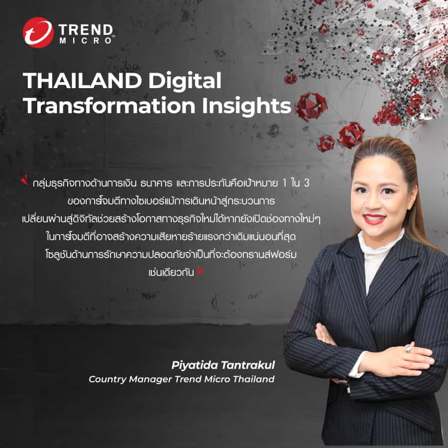 ปิยธิดา ตันตระกูล ผู้จัดการประจำประเทศไทย บริษัท เทรนด์ไมโคร (ประเทศไทย) จำกัด กล่าวในงาน Thailand Digital Transformation Insights for BFSI Business เมื่อเร็วๆ นี้ ซึ่งเป็นงานสัมมนาที่จัดขึ้นให้กับกลุ่มองค์กรธุรกิจด้านการเงินการธนาคารและการประกัน เพื่อถ่ายทอดวิสัยทัศน์ ภาพรวมและมุมมองเชิงลึกเกี่ยวกับภัยคุกคาม ที่มีต่อธุรกิจภาคการเงินและการธนาคาร โดยปัจจุบันนับเป็นช่วงเวลาที่ทุกคนและทุกองค์กรนั้นต้องคำนึงถึงและมองเห็นภาพของการเปลี่ยนแปลงในเทคโนโลยี ทั้งในแง่ของการนำมาขับเคลื่อนธุรกิจให้มีประสิทธิภาพสูงสุด และในอีกแง่ที่สำคัญคือการนำเทคโนโลยีรวมถึงแนวคิดใหม่ๆ มาใช้ในการปกป้องให้ธุรกิจปลอดภัยจากภัยคุกคามต่างๆ การก้าวสู่แนวทางการเปลี่ยนแปลงองค์กรสู่ ดิจิทัลทรานส์ฟอร์เมชัน ได้อย่างปลอดความกังวลจากภัยคุกคามไซเบอร์ที่อาจแทรกซึมเข้ามาได้หากองค์กรไม่ระมัดระวัง ทั้งในเรื่องของการเตรียมพร้อมและการลงทุนไปกับเทคโนโลยีการป้องกันยุคใหม่