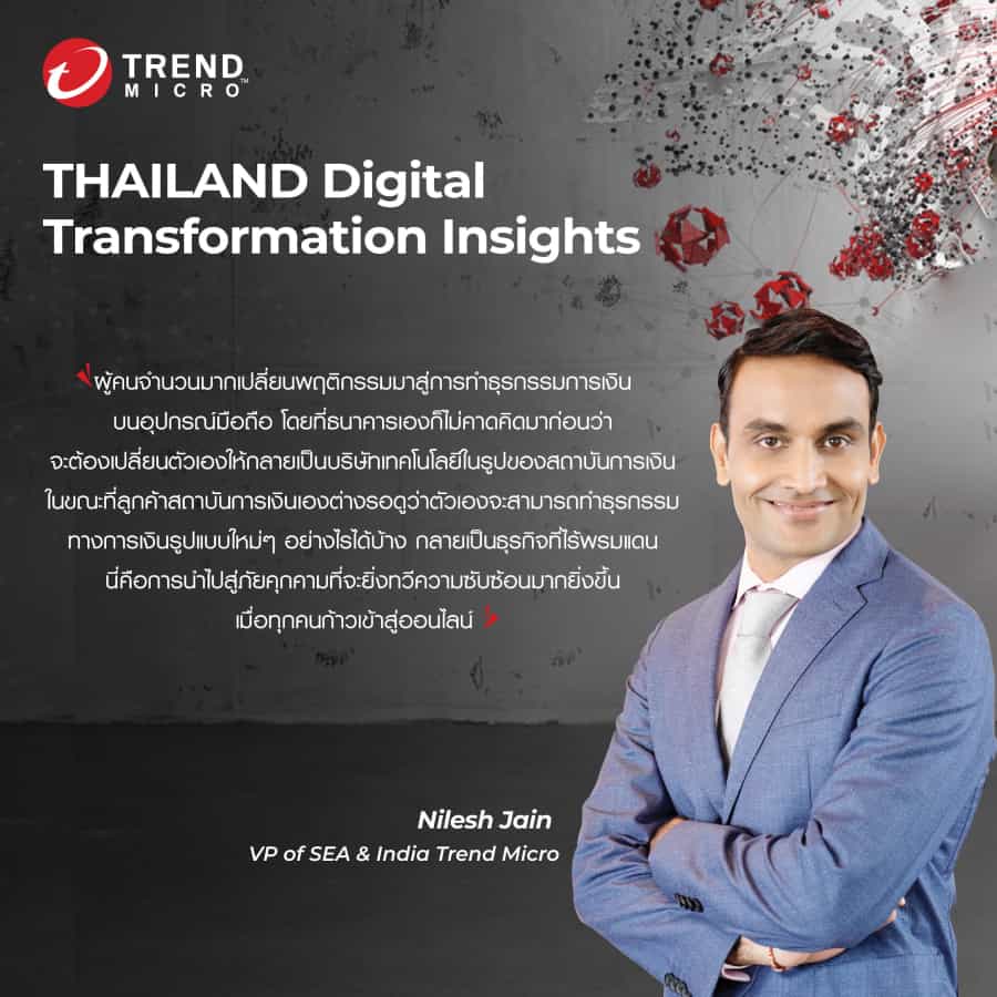 นีเลช เจน รองประธานประจำภูมิภาคเอเชียตะวันออกเฉียงใต้และอินเดีย เทรนด์ไมโคร ได้กล่าวถึงการเปลี่ยนแปลงในอุตสาหกรรมการเงิน “ผู้คนจำนวนมากเปลี่ยนพฤติกรรมมาสู่การทำธุรกรรมการเงินบนอุปกรณ์มือถือ โดยที่ธนาคารเองก็ไม่คาดคิดมาก่อนว่าจะต้องเปลี่ยนตัวเองให้กลายเป็นบริษัทเทคโนโลยีในรูปของสถาบันการเงิน ในขณะที่ลูกค้าสถาบันการเงินเองต่างรอดูว่าตัวเองจะสามารถทำธุรกรรมทางการเงินรูปแบบใหม่ๆ อย่างไรได้บ้าง”