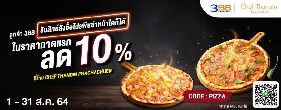 ร้านอาหารอิตาเลี่ยนรสชาติถูกปากคนไทย ทั้งพิซซ่า สเต็ก สปาเก็ตตี้ หอยลายผัดเนย ฯลฯ ลูกค้า 3BB รับสิทธิ์สั่งซื้อโปรพิซซ่าหน้าใดก็ได้ในราคาถาดแรกลด10% ที่ร้าน CHEF THANOM PRACHACHUEN (สามารถสั่งแบบ half ได้) เพียงโชว์สื่อและแอป 3BB Member หน้าแรกเพื่อรับสิทธิ์ที่ LINE: @chefthanom.pcc หรือที่หน้าร้าน และใช้ Code: PIZZA สิทธิพิเศษถึงวันที่ 31 สิงหาคม 2564