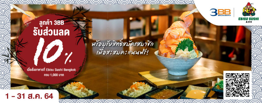 หากใครกำลังมองหาร้านอาหารญี่ปุ่นคุณภาพดี สมราคา ต้องมาที่ Ebisu Sushi Bangkok ที่นี่เป็นมากกว่าร้านซูชิและยืนหยัดคู่กับชาวเอกมัยมากว่าครึ่งทศวรรษให้ลูกค้าได้อิ่มอร่อยกับเมนูอาหารญี่ปุ่นมากมาย ลูกค้า 3BB เพียงโชว์สื่อโปรโมทที่หน้าร้าน รับส่วนลด 10% เมื่อสั่งอาหารครบ 1,000 บาท พร้อมรับสิทธิ์สมัครสมาชิกเพื่อสะสมคะแนนฟรี ! ระยะเวลารับสิทธิ์ ตั้งแต่วันนี้ถึง 31 สิงหาคม 2564