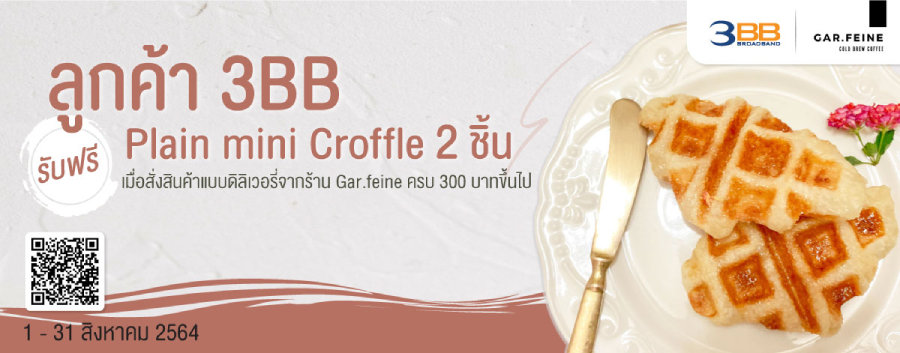 สำหรับผู้ที่ชื่นชอบกาแฟสกัดเย็นและ Croffle พลาดไม่ได้ที่ Gar.feine เจริญนคร ลูกค้า 3BB รับฟรีทันที Plain mini Croffle 2 ชิ้น เมื่อสั่งสินค้าแบบเดลิเวอรี่จากร้านครบ 300 บาทขึ้นไป ตั้งแต่วันนี้ถึง 31 สิงหาคม 2564 เพียงโชว์สื่อประชาสัมพันธ์ทาง Facebook Inbox หรือ LINE: https://lin.ee/dEm2r2f