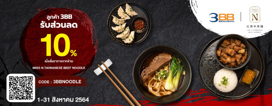 พร้อมโชว์สื่อประชาสัมพันธ์ทาง LINE ของร้าน @missnbeefnoodle และแจ้ง Code : 3BBNOODLE รับส่วนลด 10% ไปเลย ถึงวันที่ 31 สิงหาคม 2564