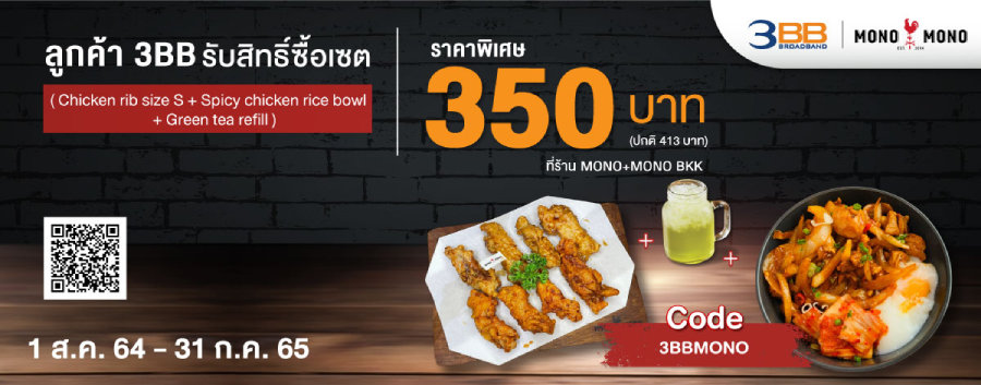 ร้านไก่ทอดเกาหลีสไตล์นิวยอร์กที่ได้รับการการันตีความอร่อยด้วยการติดอันดับ 1 ใน 7 ไก่ทอดที่อร่อยที่สุดในโลกจาก foodnetwork.com ลูกค้า 3BB รับสิทธิ์ซื้อเซต Chicken rib size S + Spicy chicken rice bowl + Green tea refill ราคาพิเศษ 350 บาท (ปกติ 413 บาท) ที่ร้าน MONO+MONO BKK ช่องทางการรับสิทธิ์ โชว์สื่อประชาสัมพันธ์และแอป 3BB Member ที่หน้าร้านพร้อมแจ้ง Code: 3BBMONO สิทธิพิเศษถึงวันที่ 31 กรกฎาคม 2565