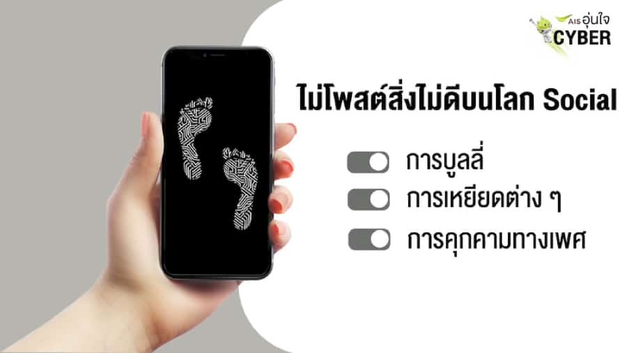 AIS อุ่นใจCyber มีความห่วงใยลูกค้าและคนไทยในการใช้งานอินเตอร์เน็ตและออนไลน์ทุกรูปแบบ ย้ำเตือนถึงช่องว่างที่อาจเกิดขึ้นจากการเหยียบย่ำบนออนไลน์จนสร้างเป็นรอยเท้าข้อมูลในทุกที่อาจทำให้มิจฉาชีพ หรือผู้ไม่หวังดีนำข้อมูลของเราไปใช้งานในทางที่ผิดทั้งไม่ว่าจะต่อตัวเองหรือผู้ใช้งานอื่นก็ตาม เพราะฉะนั้นเมื่อใช้งานอินเตอร์เน็ตทุกรูปแบบต้องมีสติ ไม่โพสรูปหรือข้อความที่สุ่มเสี่ยงต่อการบอกที่ตั้ง รวมถึงข้อมูลสำคัญต่างๆ และบอกตัวเองเสมอว่าทุกกิจกรรมที่เราทำมีรอยเท้าฝากไว้เสมอ เพื่อการใช้งานที่อุ่นใจไร้ภัยไซเบอร์