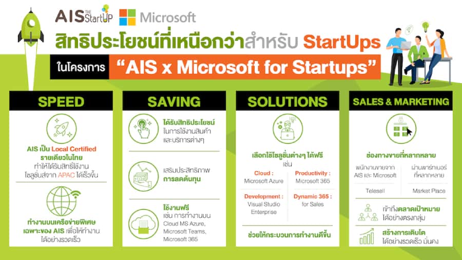 หลังจากที่ AIS ได้ประกาศความร่วมมือกับ ไมโครซอฟท์ ประเทศไทย ในฐานะพันธมิตรทางธุรกิจ หรือ Strategic Partner ไปได้ไม่นาน ก็ได้เดินหน้าขยายโซลูชั่นเทคโนโลยีสู่กลุ่มสตาร์ทอัพซึ่งเป็นอีกฐานสำคัญในการขับเคลื่อนเศรษฐกิจดิจิทัลให้เติบโตไปได้ ภายใต้โครงการ “AIS x Microsoft for Startups” โดย AIS จะเป็นพันธมิตรรายแรกอย่างเป็นทางการและเป็นรายเดียวในประเทศไทยในขณะนี้ เพื่อร่วมยกระดับและขับเคลื่อนศักยภาพของสตาร์ทอัพไทย มีเป้าหมายหลักในการมุ่งสนับสนุนสตาร์ทอัพไทยผ่านการมอบโอกาสในการเข้าถึงเทคโนโลยีที่จำเป็น พร้อมคำแนะนำจากผู้เชี่ยวชาญ และข้อมูลเชิงลึกที่มีความสำคัญต่างๆ รวมถึงโอกาสในการเร่งการเติบโตของธุรกิจผ่านการเชื่อมต่อกับลูกค้าและพันธมิตร