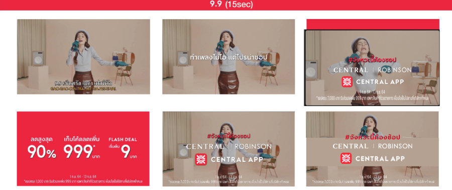 โดย “Central/Robinson 9.9 Mega Festival” ครั้งนี้ ห้างเซ็นทรัล และโรบินสัน ได้ฉีกวิธีการสื่อสารใหม่ นำคอนเซ็ปต์ Shoppertainment มาเป็นกลยุทธ์หลัก โดยใช้ความสนุกสนานจากภาพยนตร์โฆษณา นำไปสู่การสร้างความจดจำในแคมเปญ ภายใต้ธีม ‘#จังหวะนี้ต้องช้อป’ และสร้างให้เกิดกระแสในกลุ่มนักช้อป รวมถึง วงการดิจิทัล มาร์เกตติ้ง โดยเริ่มคิกออฟโปรโมชั่นในเดือนกันยายน ต้อนรับวันที่ 9 เดือน 9 กับ “Central/Robinson 9.9 Mega Festival ที่มาในคอนเซ็ปต์ ‘ทำเพลงไม่โอ แต่โปรน่าช้อป’ พร้อมภาพยนตร์โฆษณาตัวแรกที่จะช่วยให้ทุกคนเพลิดเพลินไปกับความสนุกของการร้องเพลงประจำแคมเปญที่ไม่ซ้ำแบบใคร