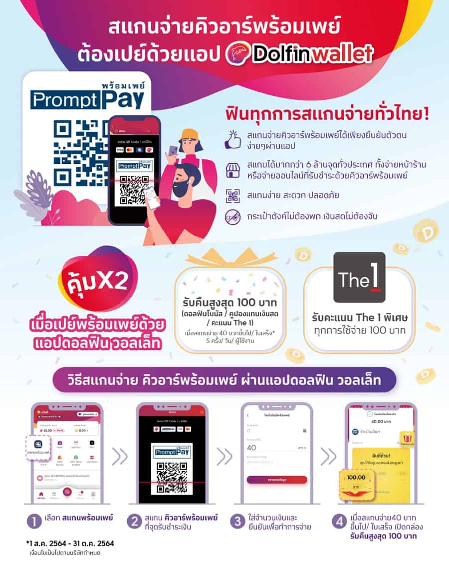 ผู้ที่สนใจและลูกค้าดอลฟินสามารถมาร่วมฟินกับทุกการใช้จ่ายแบบปลอดภัยไร้เงินสดได้แล้ว เพียงแจ้งร้านค้าว่า “จ่ายด้วย คิวอาร์ พร้อมเพย์” และสแกนคิวอาร์โค้ดจ่ายผ่านแอปดอลฟิน วอลเล็ท ที่ร้านค้าทั้งประเภทออฟไลน์และออนไลน์ ที่รับสแกนจ่ายด้วย Thai QR PromptPay กว่าหกล้านจุดทั่วประเทศ เพื่อรับคะแนน The1 และสิทธิประโยชน์มากมายได้แล้วตั้งแต่วันนี้เป็นต้นไป