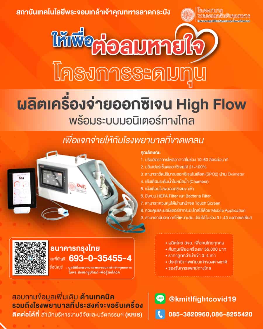สถาบันเทคโนโลยีพระจอมเกล้าเจ้าคุณทหารลาดกระบัง (สจล.) เผยฟีเจอร์เครื่องจ่ายออกซิเจน High Flow ที่มาพร้อม ‘รีโมท คอนโทรล’ (Remote Control) ช่วยให้บุคลากรทางการแพทย์ 1 คนสามารถควบคุมเครื่องฯ ได้สูงถึง 20 เครื่อง ในการเฝ้าระวังและติดตามอาการผู้ป่วยแบบทางไกลได้ตลอด 24 ชั่วโมง ครอบคลุมผู้ป่วยโควิดที่รักษาตัวภายในโรงพยาบาล โดยมีระบบรักษาความปลอดภัยสูง ได้เดินทางถึงโรงพยาบาลสิรินธร พร้อมใช้จริงกับผู้ป่วยโควิดเป็นที่เรียบร้อยแล้ว และภายในสองสัปดาห์นี้ สจล. จะเร่งผลิตเพื่อแจกจ่ายไปยังโรงพยาบาลทั่วไทยกว่า 400 แห่ง สอบถามข้อมูลเพิ่มเติมด้านเทคนิค รวมถึงโรงพยาบาลที่ประสงค์จะขอรับเครื่องออกซิเจน High Flow ติดต่อ สำนักบริหารงานวิจัยและนวัตกรรมพระจอมเกล้าลาดกระบัง (KRIS) โทร. 085-382-0960, 086-825-5420 หรือไลน์ไอดี @kmitlfightcovid19