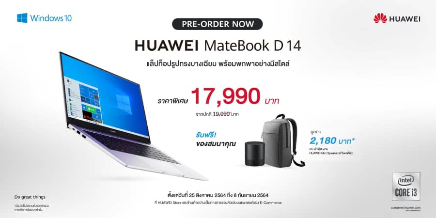 หัวเว่ยเปิดให้พรีออเดอร์แล็ปท็อป HUAWEI MateBook D 14 รุ่น 10th Gen Intel Core i3 processor สี Mystic Silver ในราคาพิเศษ 17,990 บาท จากราคาปกติ 19,990 บาท พร้อมรับของสมนาคุณสุดคุ้มได้แก่ กระเป๋าเป้สะพายหลัง มูลค่า 1,090 บาท และลำโพง HUAWEI Mini Speaker มูลค่า 1,090 บาท ทั้งหมดมูลค่ารวม 2,180 บาท เมื่อพรีออเดอร์ตั้งแต่วันที่ 25 สิงหาคม 2564 ถึง 8 กันยายน 2564 เฉพาะช่องทางออนไลน์เท่านั้นที่ Shopee, Lazada และ HUAWEI Store โดย HUAWEI MateBook D 14 รุ่น 10th Gen Intel Core i3 processor จะพร้อมวางจำหน่ายอย่างเป็นทางการในวันที่ 9 กันยายน 2564 เป็นต้นไป