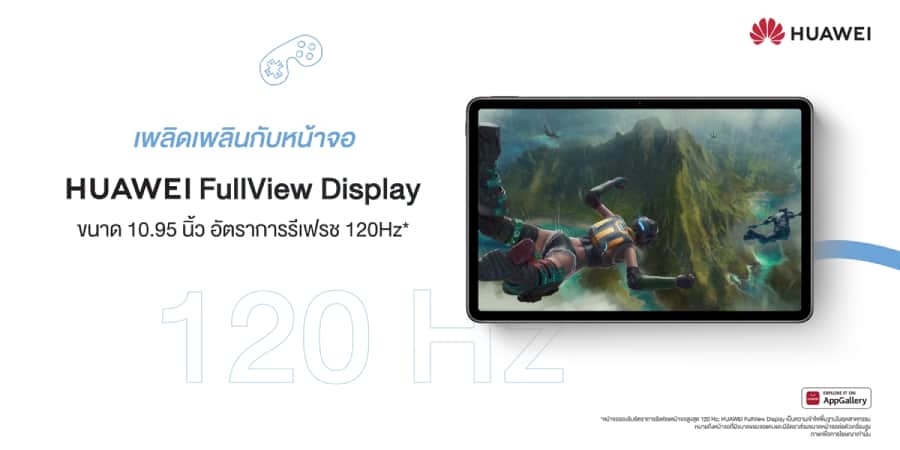 - งานก็ชิล บันเทิงก็ชัด อัดแน่นด้วยอรรถรสอย่างลื่นไหลไม่รู้จบ นอกจากจะมาด้วยอัตราการรีเฟรชหน้าจอที่สูงถึง 120 Hz แล้ว ยังเป็นหน้าจอแบบ HUAWEI FullView Display ขนาดใหญ่ 10.95 นิ้ว พอดีมือ จับถือง่ายคล่องตัว ความละเอียด 2K ให้ภาพดูคมชัดสมจริง และอัตราส่วนหน้าจอต่อตัวเครื่อง 86% รองรับรูปแบบการทำงาน ดูหนัง ดื่มด่ำความบันเทิงไปจนถึงการแต่งภาพได้ครบเพลินตาและไร้ภาพกระตุก