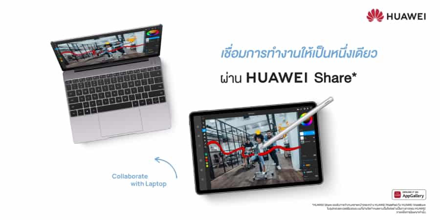 - Collaborate Mode รับส่งข้อมูลและไฟล์ต่างๆ ไปมาระหว่างแท็บเล็ตและแล็ปท็อปได้โดยไม่ต้องใช้อุปกรณ์เสริม รวมถึงสายต่อ เพียงแค่เชื่อมต่อผ่านฟังก์ชัน HUAWEI Share เท่านั้น ลดทอนความยุ่งยาก และประหยัดเวลาได้เยอะเลยทีเดียว