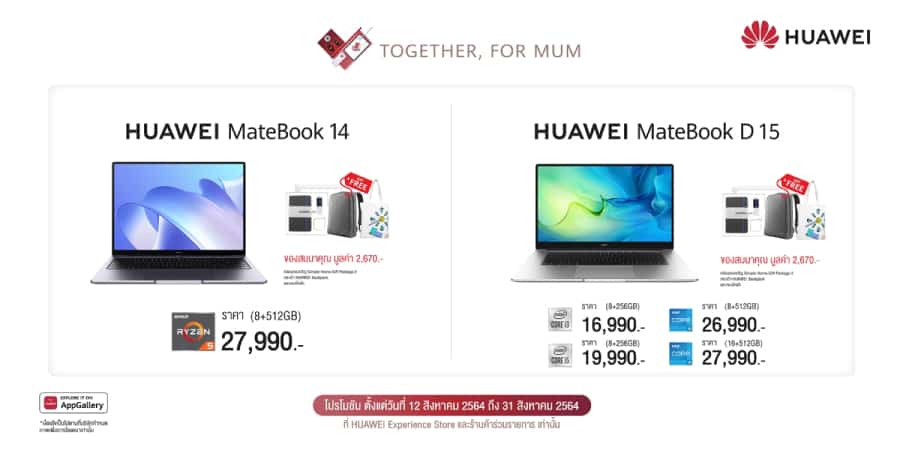เมื่อเลือกซื้อแล็ปท็อป HUAWEI MateBook 14 AMD R5 หน่วยความจำ 8GB + 512GB ราคา 27,990 บาท รับของสมนาคุณทั้งหมดไปได้เลย ไม่ว่าจะเป็น กระเป๋าเป้สะพายหลัง มูลค่า 1,090 บาท, กระเป๋า HUAWEI Canvas bag มูลค่า 290 บาท, Simple Home Gift Package 2 มูลค่า 1,290 บาท (สเปรย์หล่อลื่นอเนกประสงค์, ผ้าเช็ดทำความสะอาดหน้าจอ และสมุดจดบันทึก) มูลค่ารวมทั้งสิ้น 2,670 บาท ที่ HUAWEI Store, HUAWEI Experience Store, ร้านค้าตัวแทนจำหน่ายที่ร่วมรายการ และร้านค้าอย่างเป็นทางการของหัวเว่ยบนแพลตฟอร์ม E-Commerce ประกอบไปด้วย Shopee, Lazada และ JD Central ตั้งแต่วันที่ 12 สิงหาคม 2564 – 31 สิงหาคม 2564