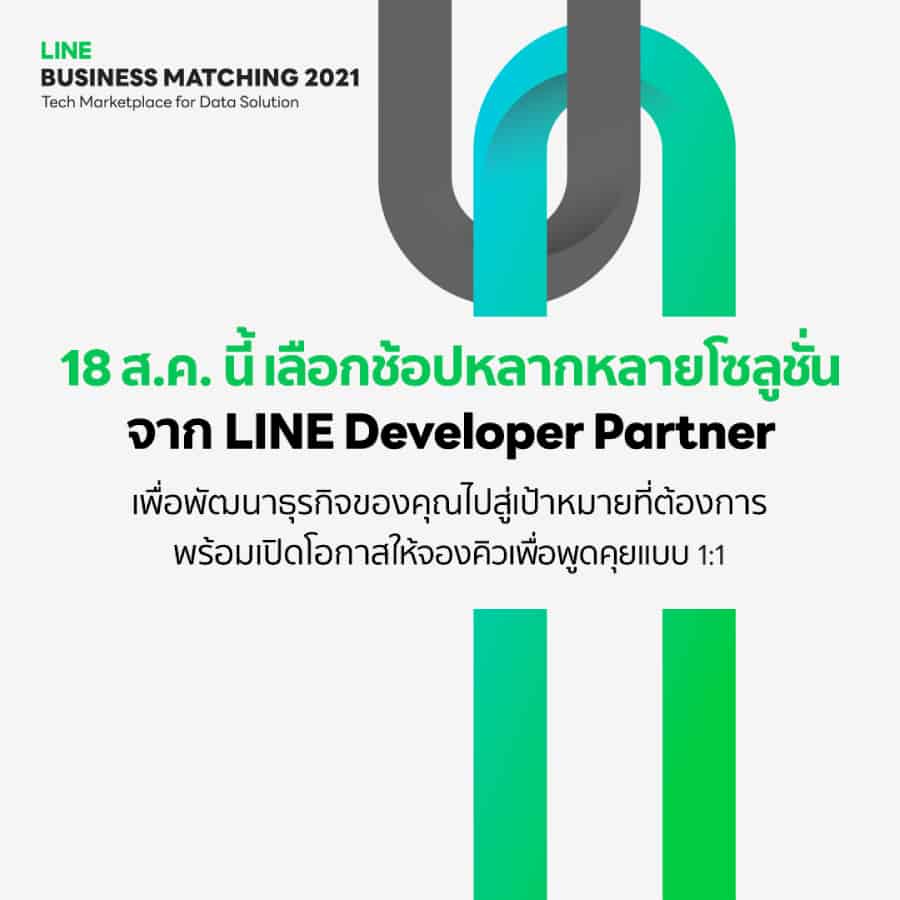LINE เล็งเห็นถึงความลำบากขององค์กรธุรกิจไทย ในการมองหานักพัฒนาโซลูชั่นการตลาดดิจิทัลมาเป็นพันธมิตรช่วยขับเคลื่อนธุรกิจให้เดินหน้าต่อได้อย่างยั่งยืน จึงจัดงาน LINE Business Matching 2021: Tech Marketplace for Data Solution” ขึ้น เพื่อให้ความรู้เจาะลึกถึงการจัดการดาต้าสำหรับธุรกิจองค์กรในโลกออนไลน์ โดยมีไฮไลท์พิเศษกับการนำเสนอโซลูชั่นน่าสนใจจาก 6บริษัทนักพัฒนาโซลูชั่นการตลาดดิจิทัลแถวหน้าของไทย ภายใต้หัวข้อยอดฮิตด้านการตลาดดิจิทัล ดังนี้
